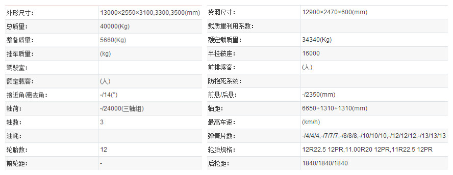 | 轮胎规格 | 12R22.5 12PR,11.00R20 12PR | 钢板弹簧片数(前/后) | -/8/8/8,-/9/9/9,-10/10/10 |