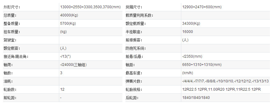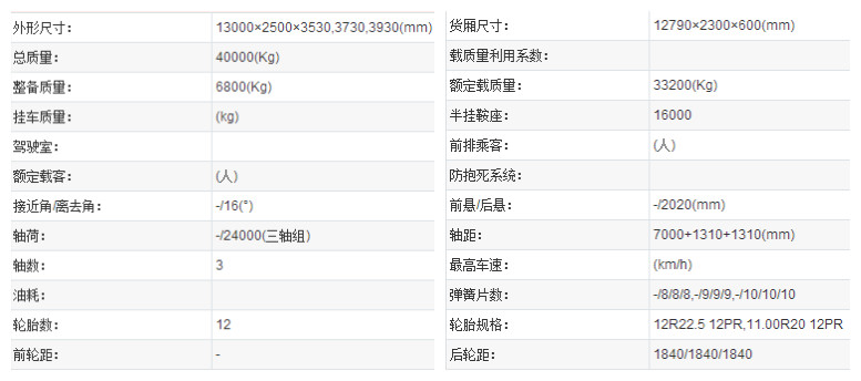| 外形尺寸(mm):(长×宽×高) | 13000×2500×3330,3530,3730 | 总质量(kg) | 40000 |